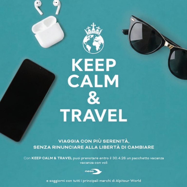 Con la promozione Keep Calm & Travel puoi prenotare entro il 30 Aprile 2026 un pacchetto vacanza con voli Neos e soggiorni con tutti i principali marchi del Gruppo Alpitour mantenendo la libertà di modificare destinazione, aeroporto o data di partenza.