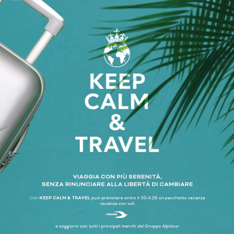 Con la promozione Keep Calm & Travel puoi prenotare entro il 30 Aprile 2026 un pacchetto vacanza con voli Neos e soggiorni con tutti i principali marchi del Gruppo Alpitour mantenendo la libertà di modificare destinazione, aeroporto o data di partenza.
